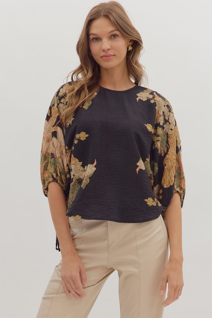 Stefan Puff Sleeve Ruffle Front Tie Top