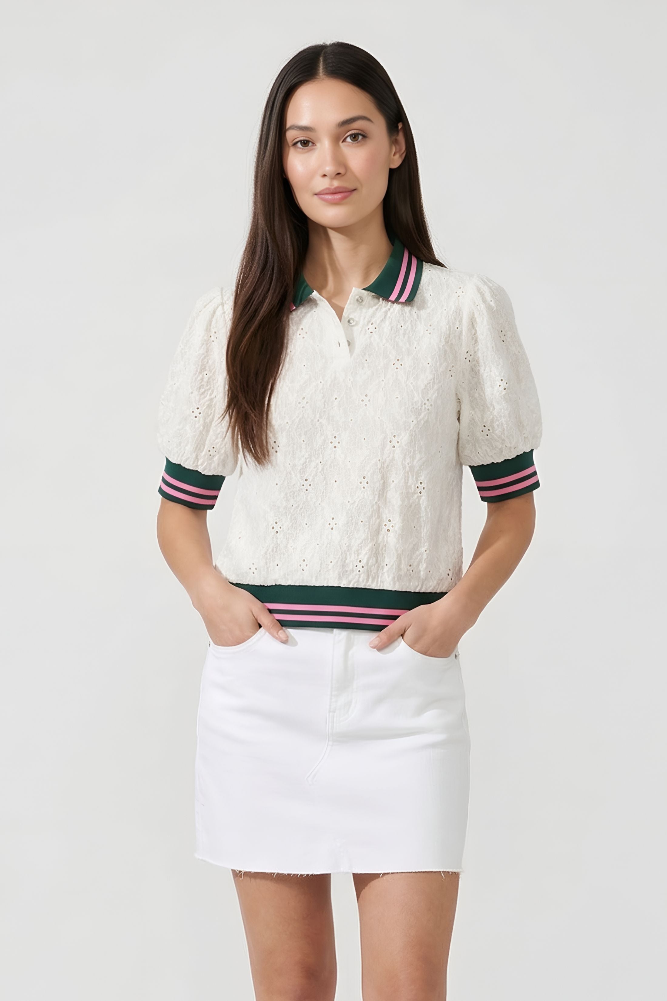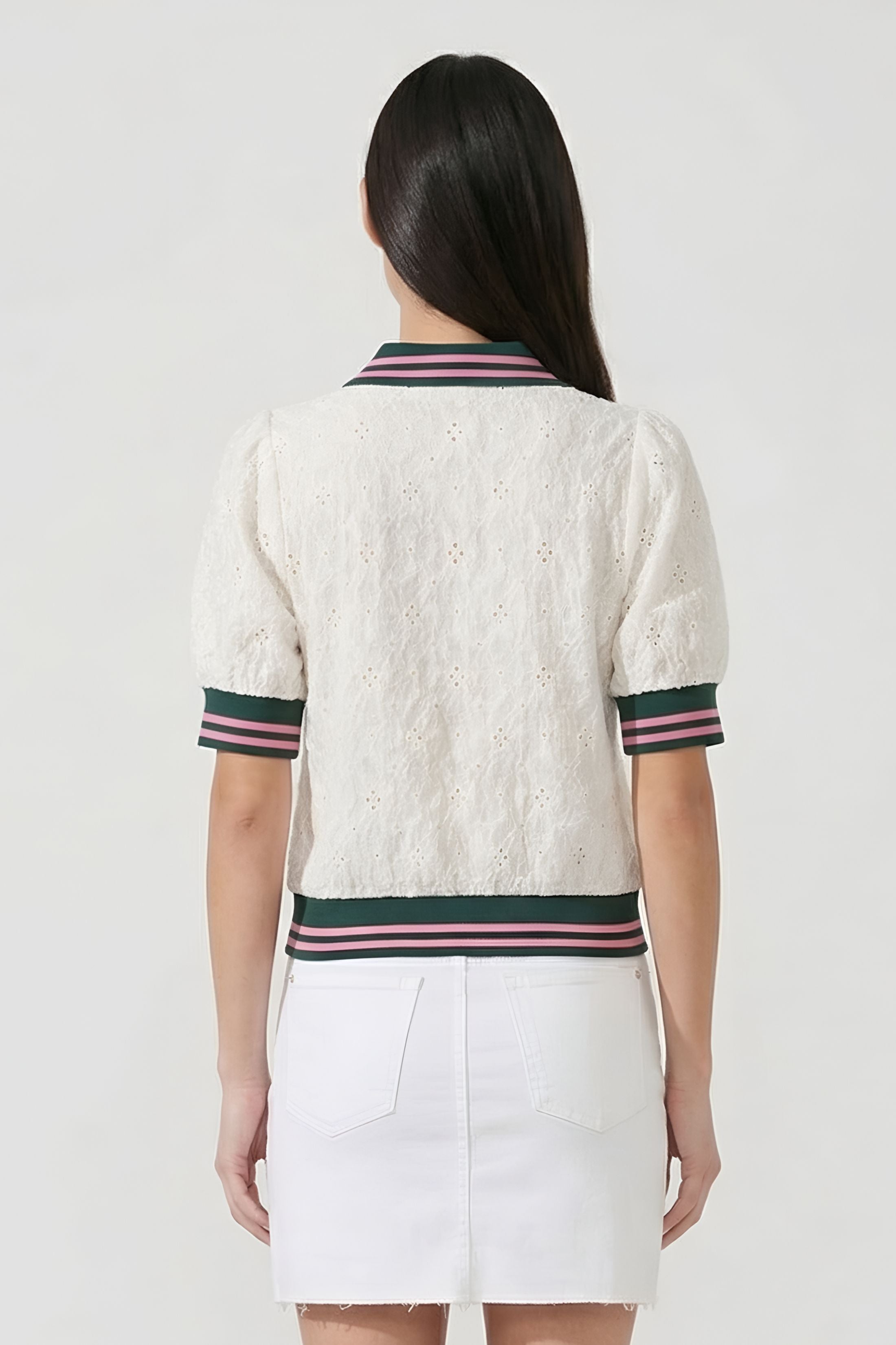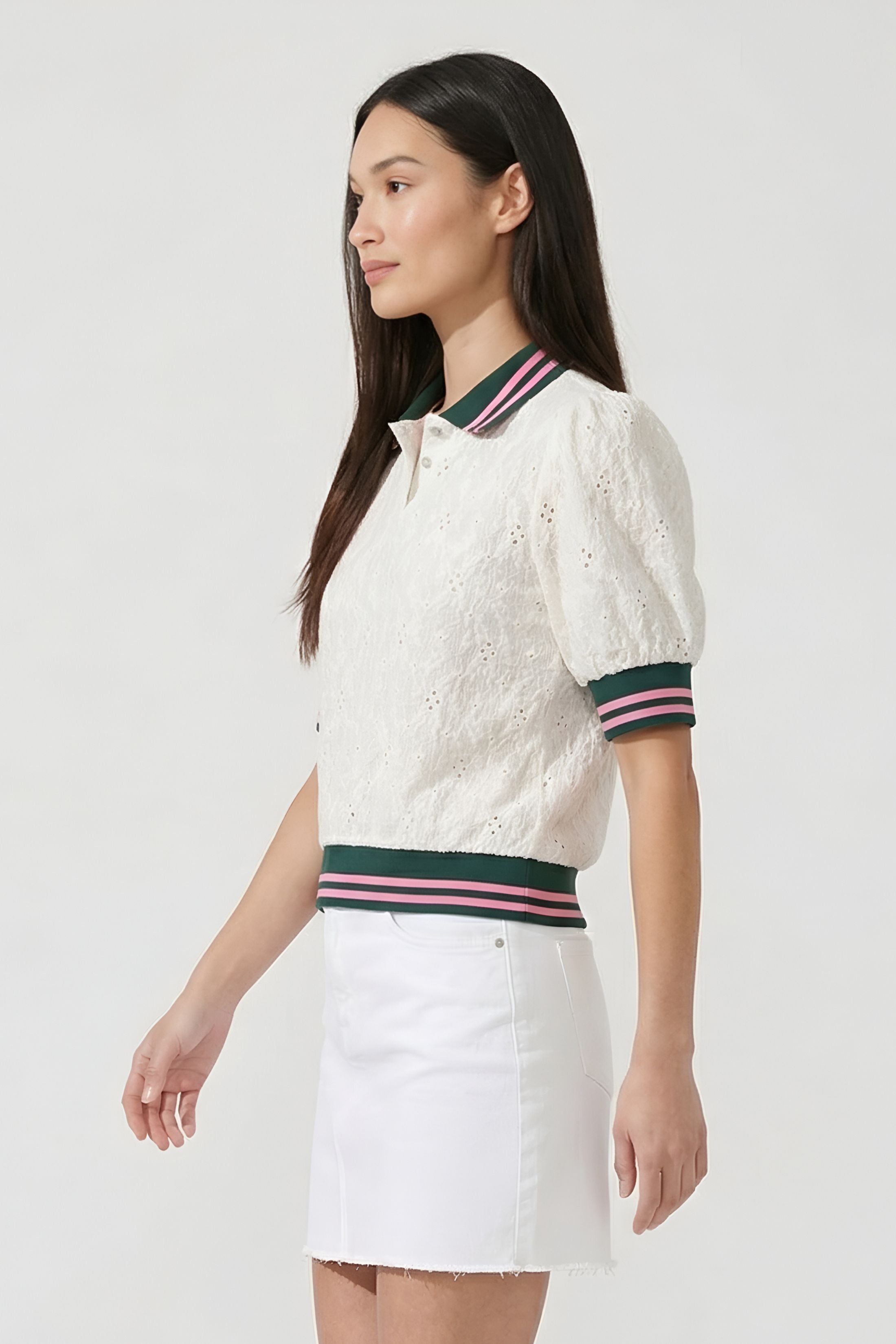 A sporty-chic update to a classic silhouette, the Brooks Striped Trim Top combines feminine texture with bold contrast detailing. Featuring delicate eyelet fabric and statement striped trim, this piece brings a polished yet playful feel to your everyday wardrobe.