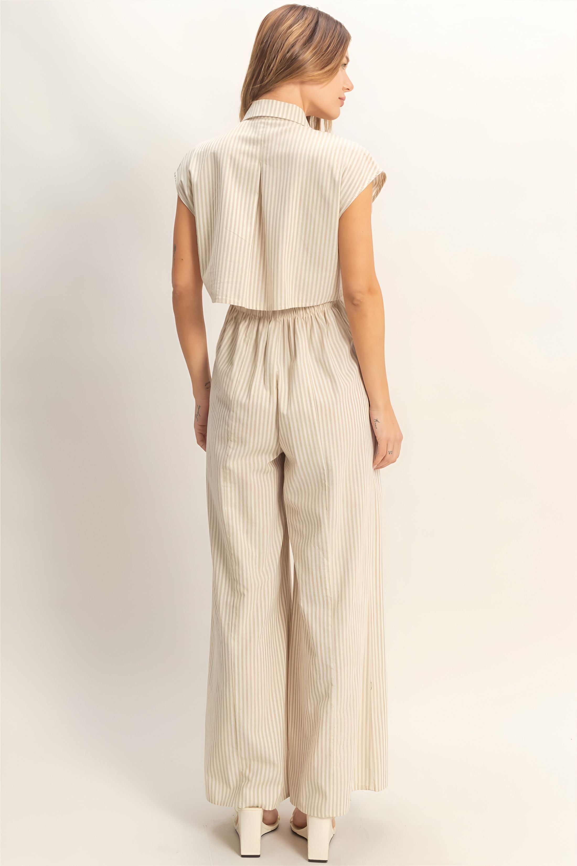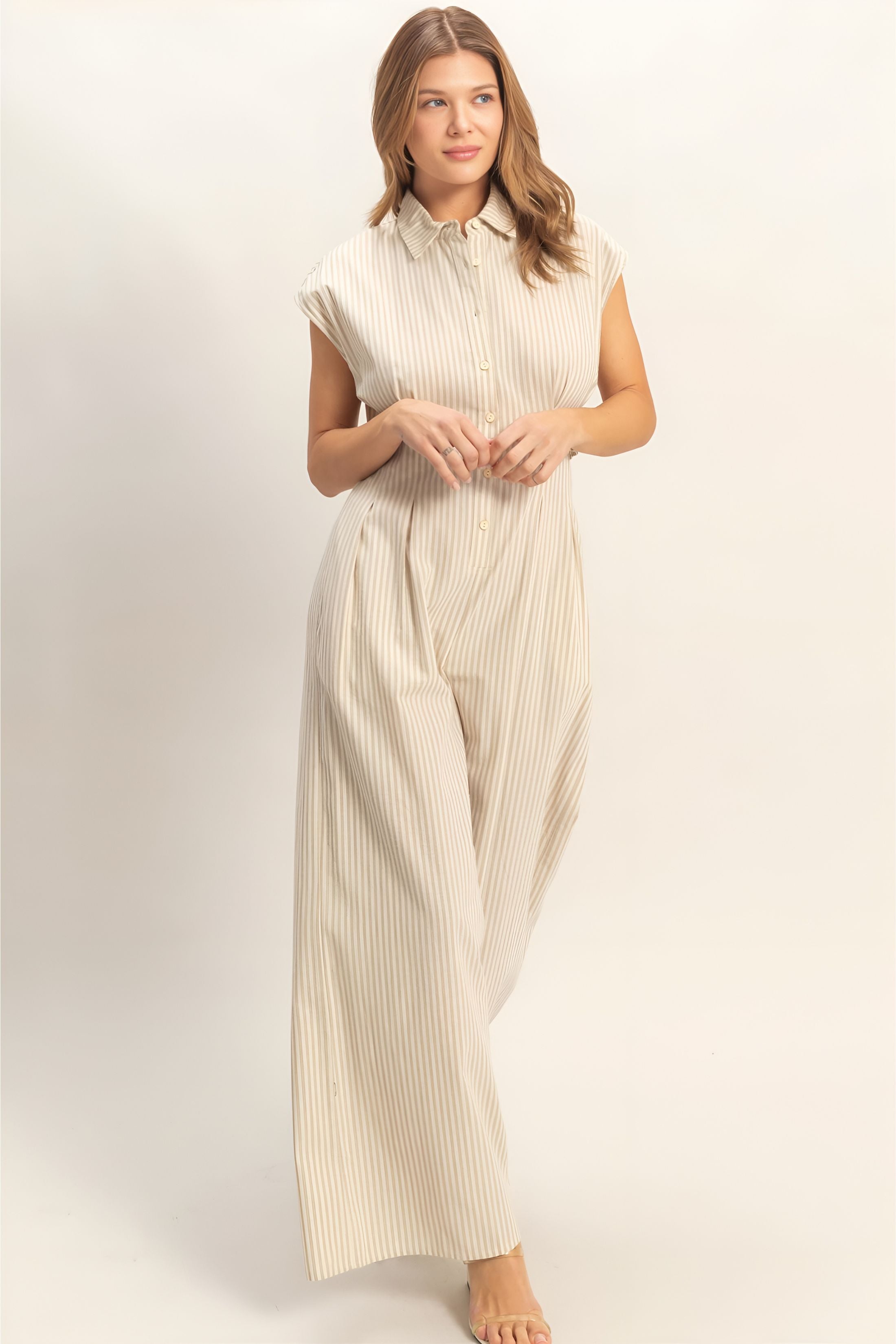 The Paige Striped Button Down Jumpsuit offers an effortless, put-together look with its classic stripe pattern and flattering silhouette. The button-down front adds a polished touch, while the easy fit keeps it comfortable for all-day wear. Chic, versatile, and perfect for warm-weather styling.