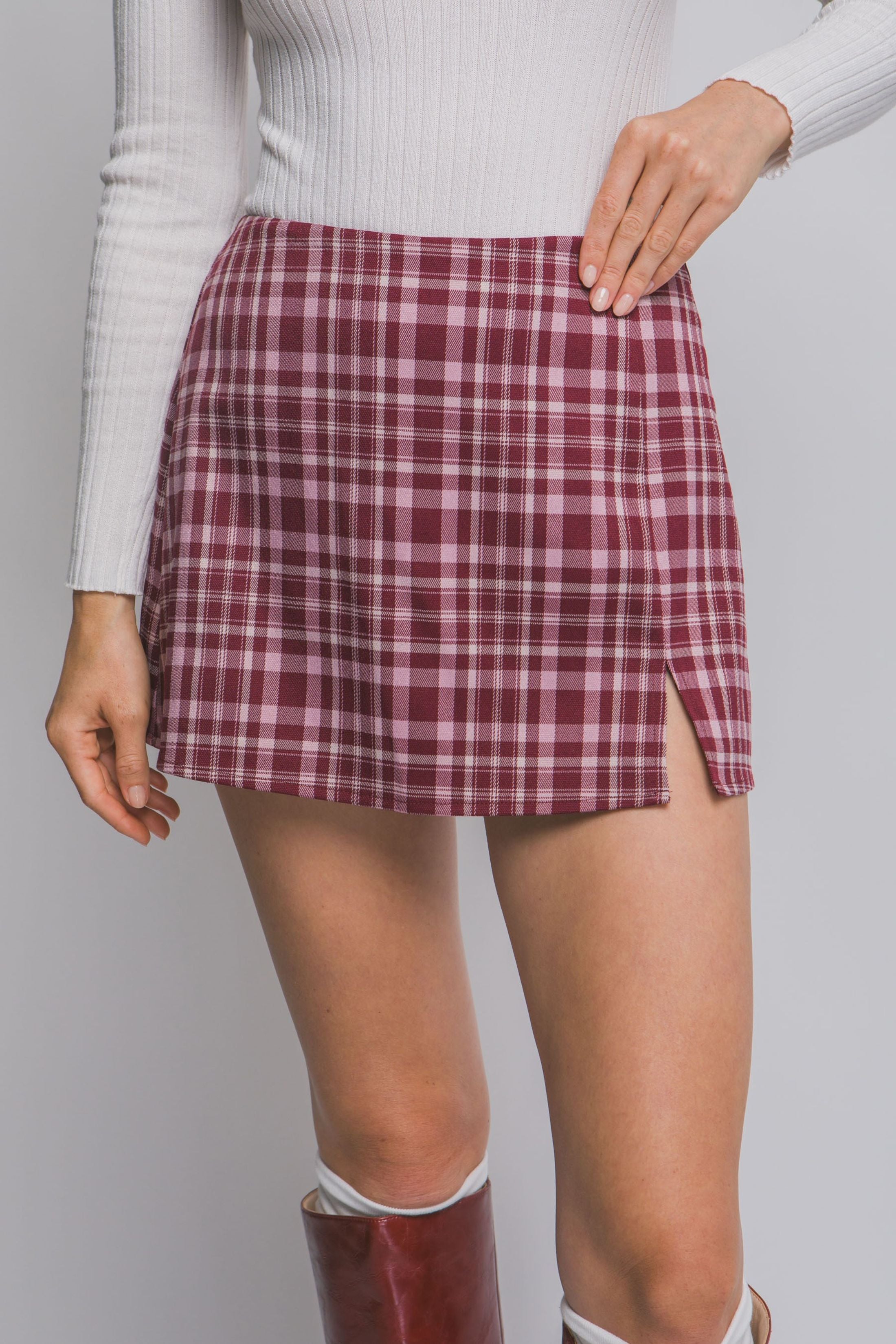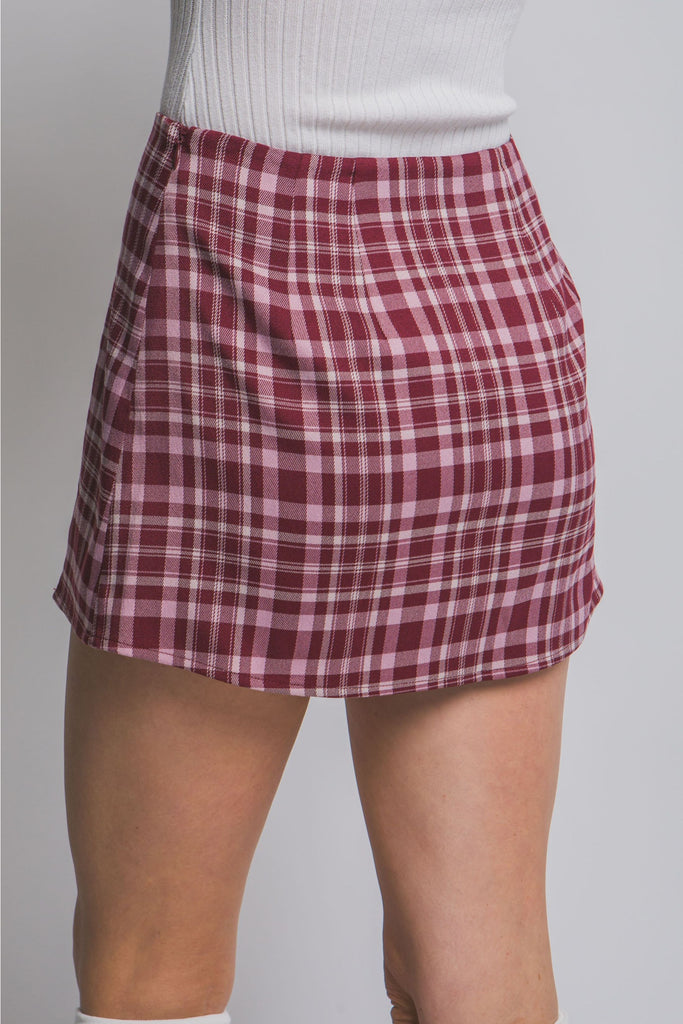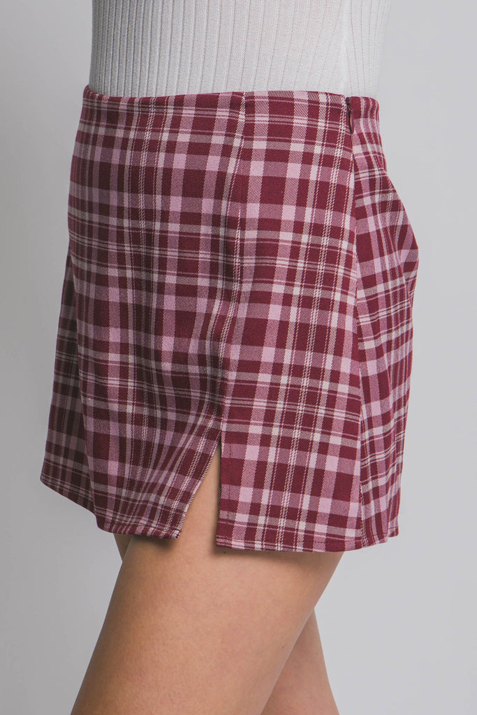 The Serena Split Front Plaid Mini Skort combines the look of a classic mini with the comfort of built-in shorts. Its plaid pattern and front slit add a modern, playful touch perfect for everyday wear or dressed-up moments.