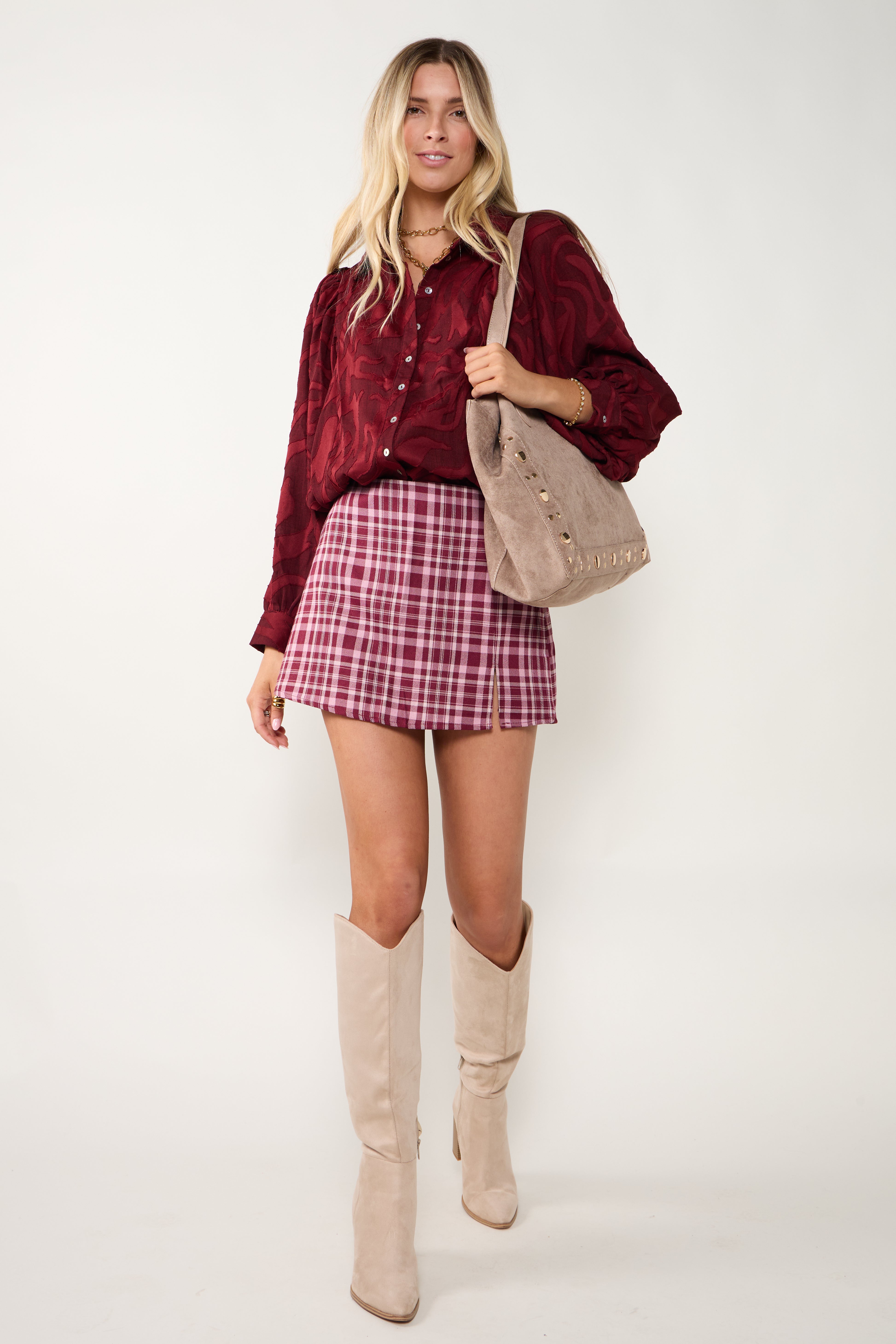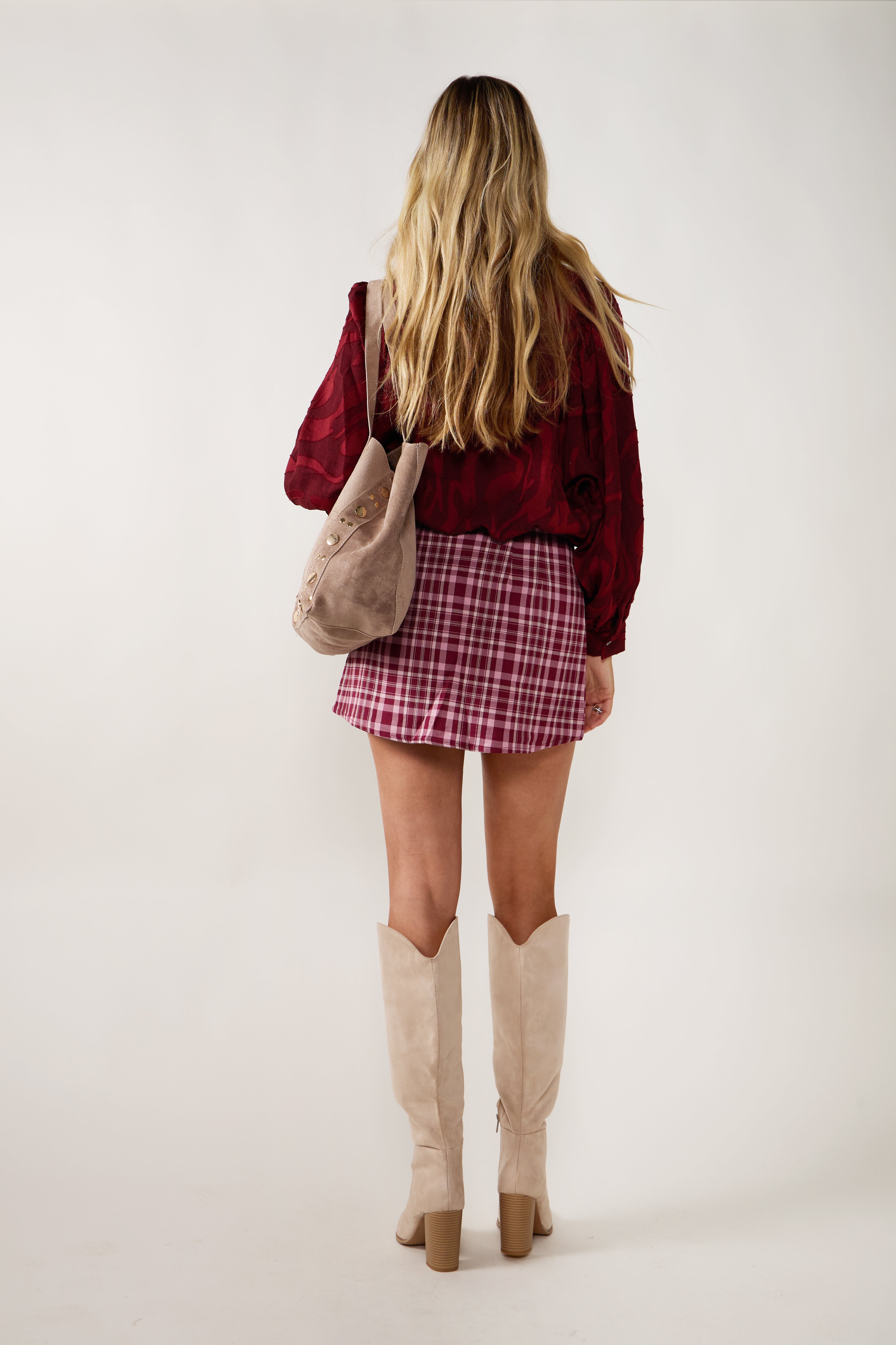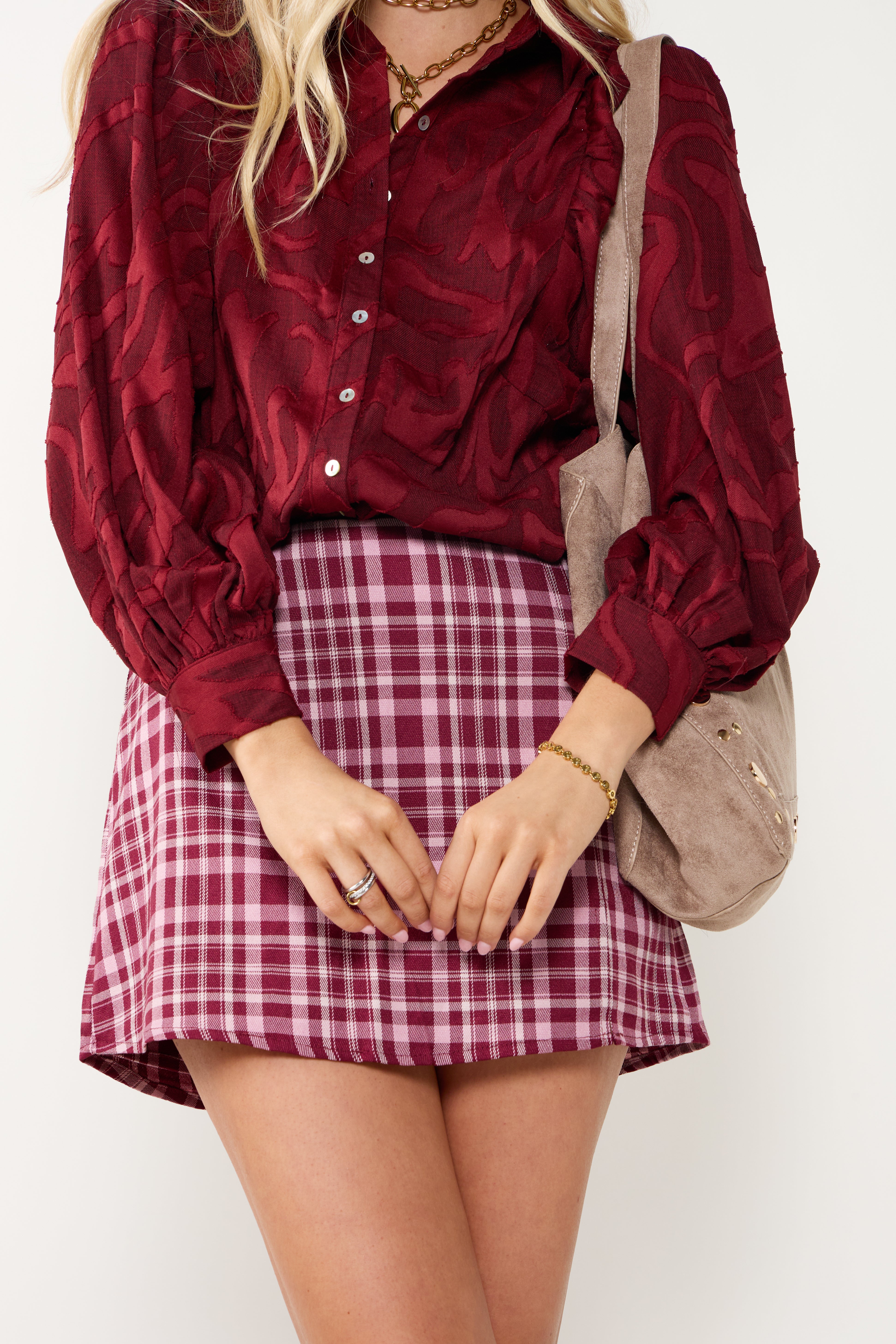 The Serena Split Front Plaid Mini Skort combines the look of a classic mini with the comfort of built-in shorts. Its plaid pattern and front slit add a modern, playful touch perfect for everyday wear or dressed-up moments.