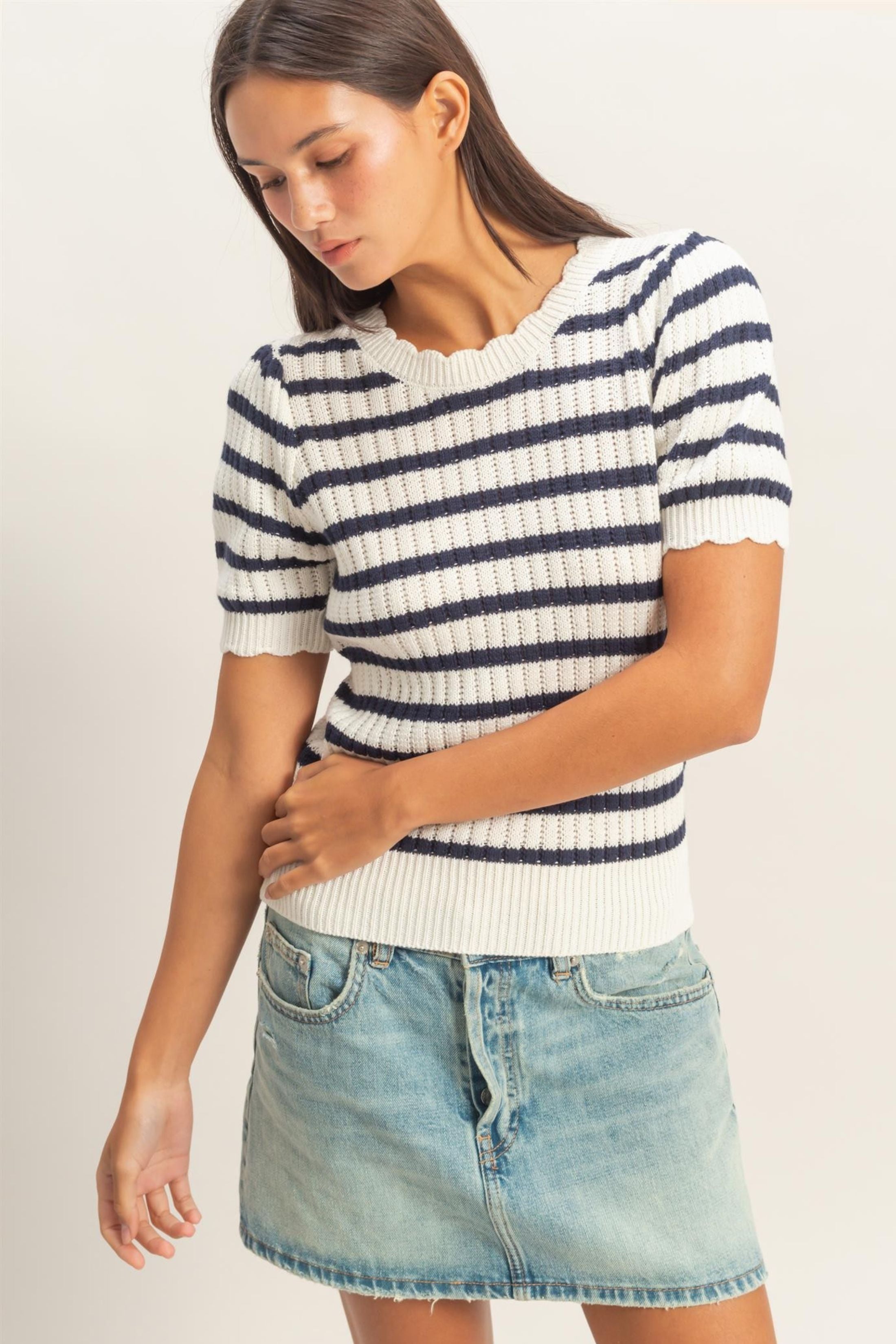 The Avery Striped Scallop Top blends timeless stripes with a feminine scalloped detail for a look that feels both classic and fresh. Lightweight and easy to style, it’s perfect for everyday wear or polished casual outfits. Effortless, charming, and versatile.