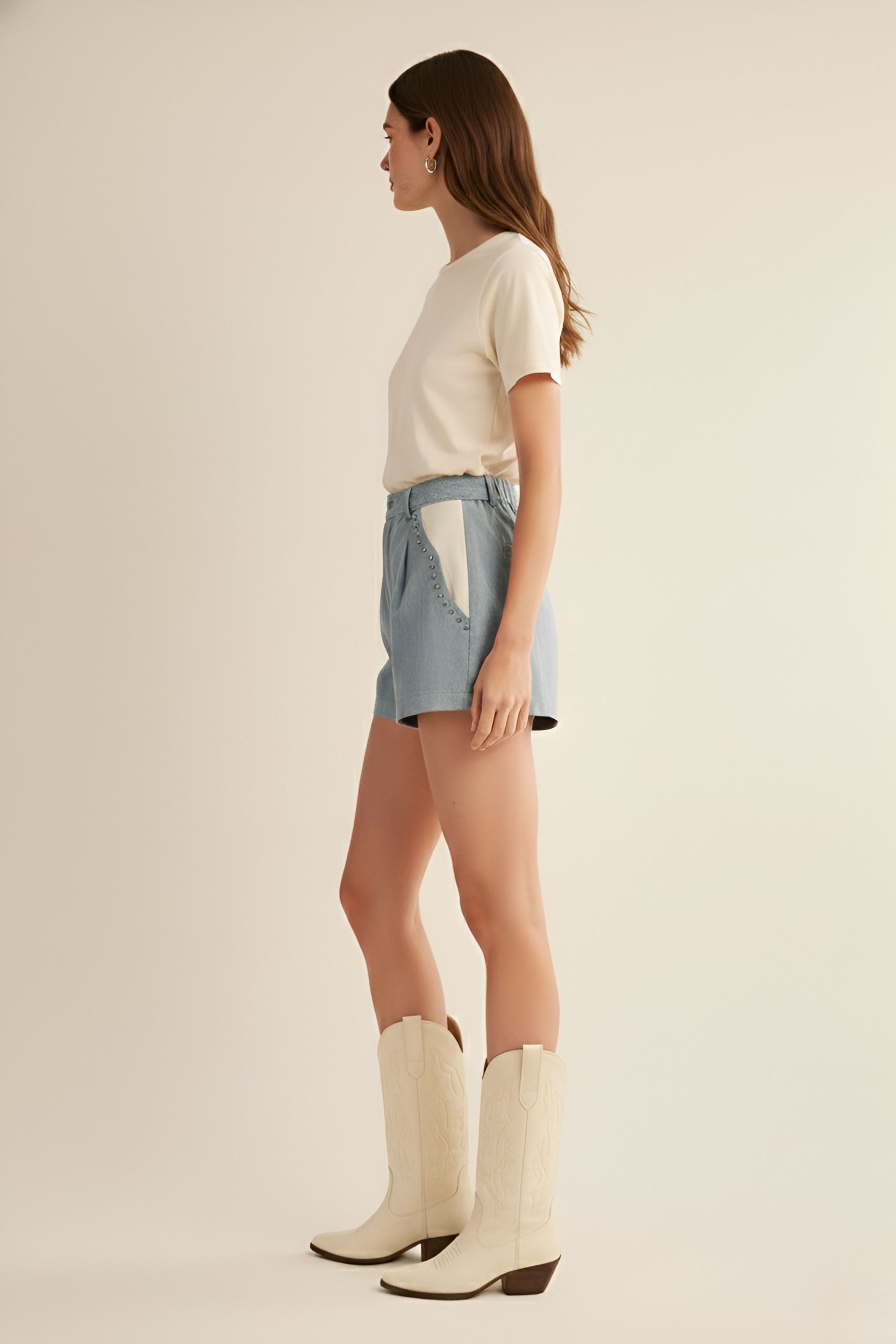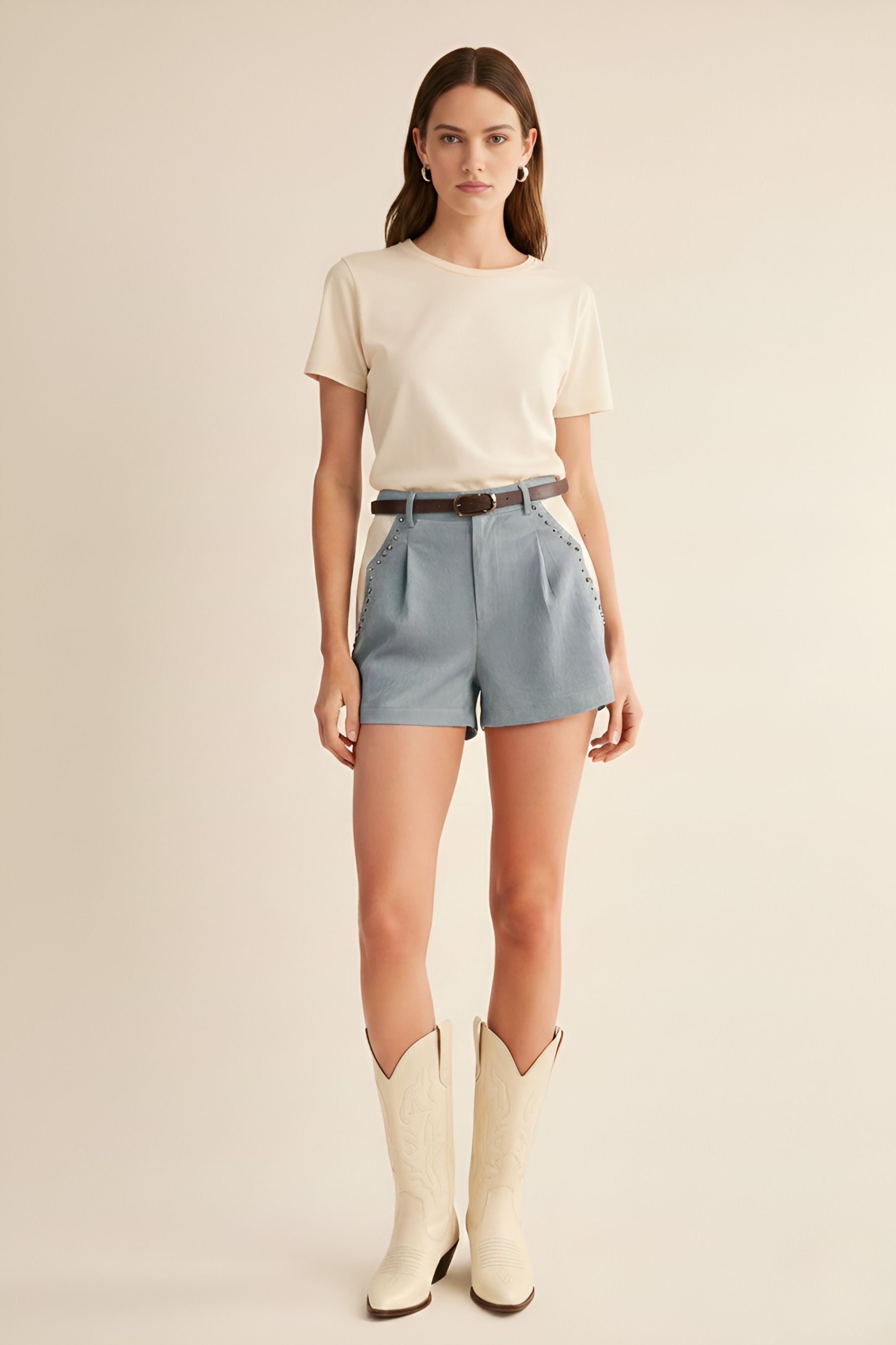 Elevate your warm-weather wardrobe with the Hannah Studded Shorts. Crafted from luxurious suede in a rich blue hue, these shorts feature eye-catching studded detailing that adds an edgy, sophisticated touch to any outfit. Perfect for transitioning from day to night, pair them with a simple tee for casual elegance or dress them up with a silky blouse for evening appeal. A versatile piece that brings texture and personality to your collection.