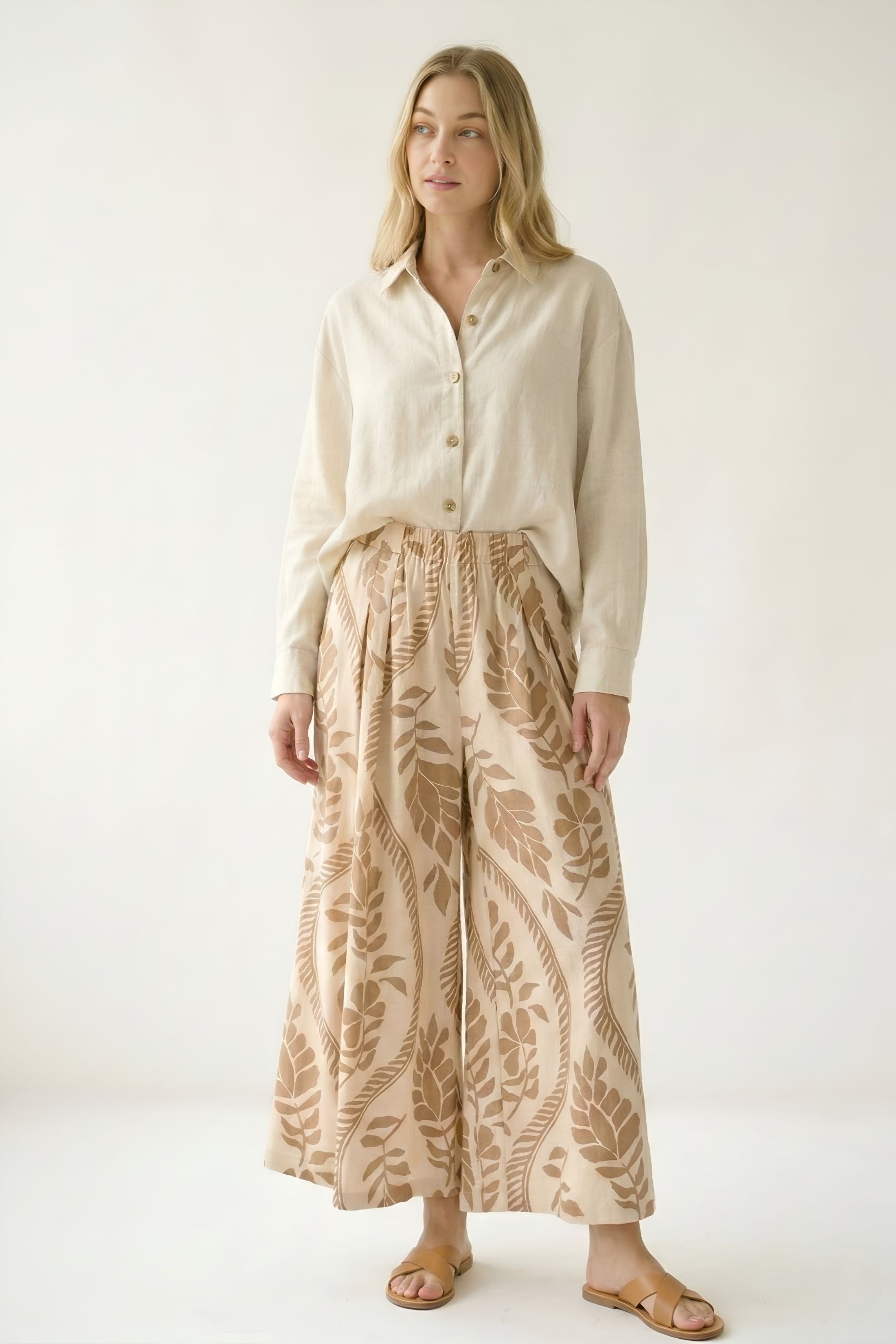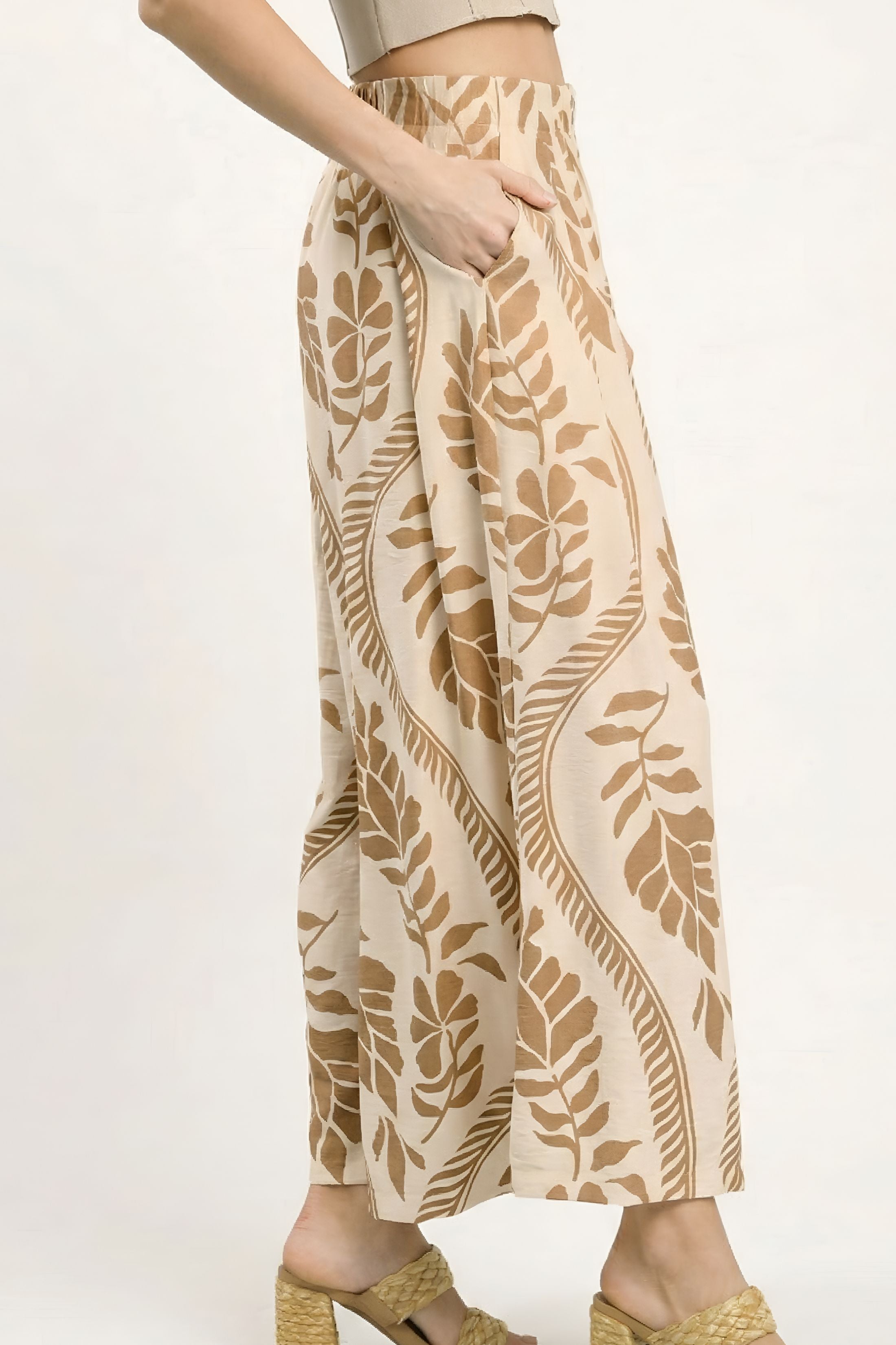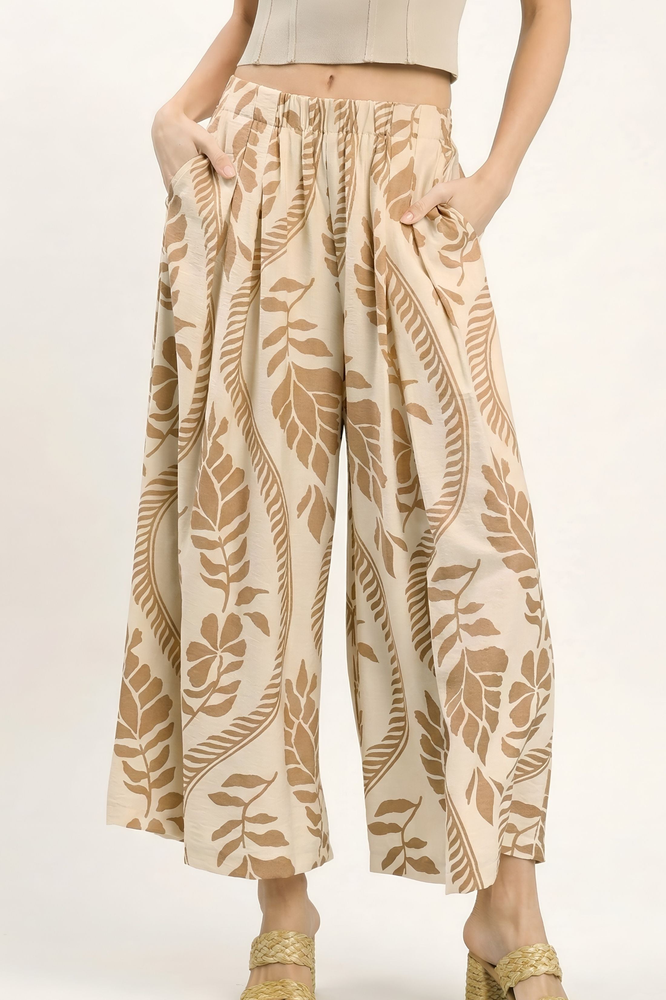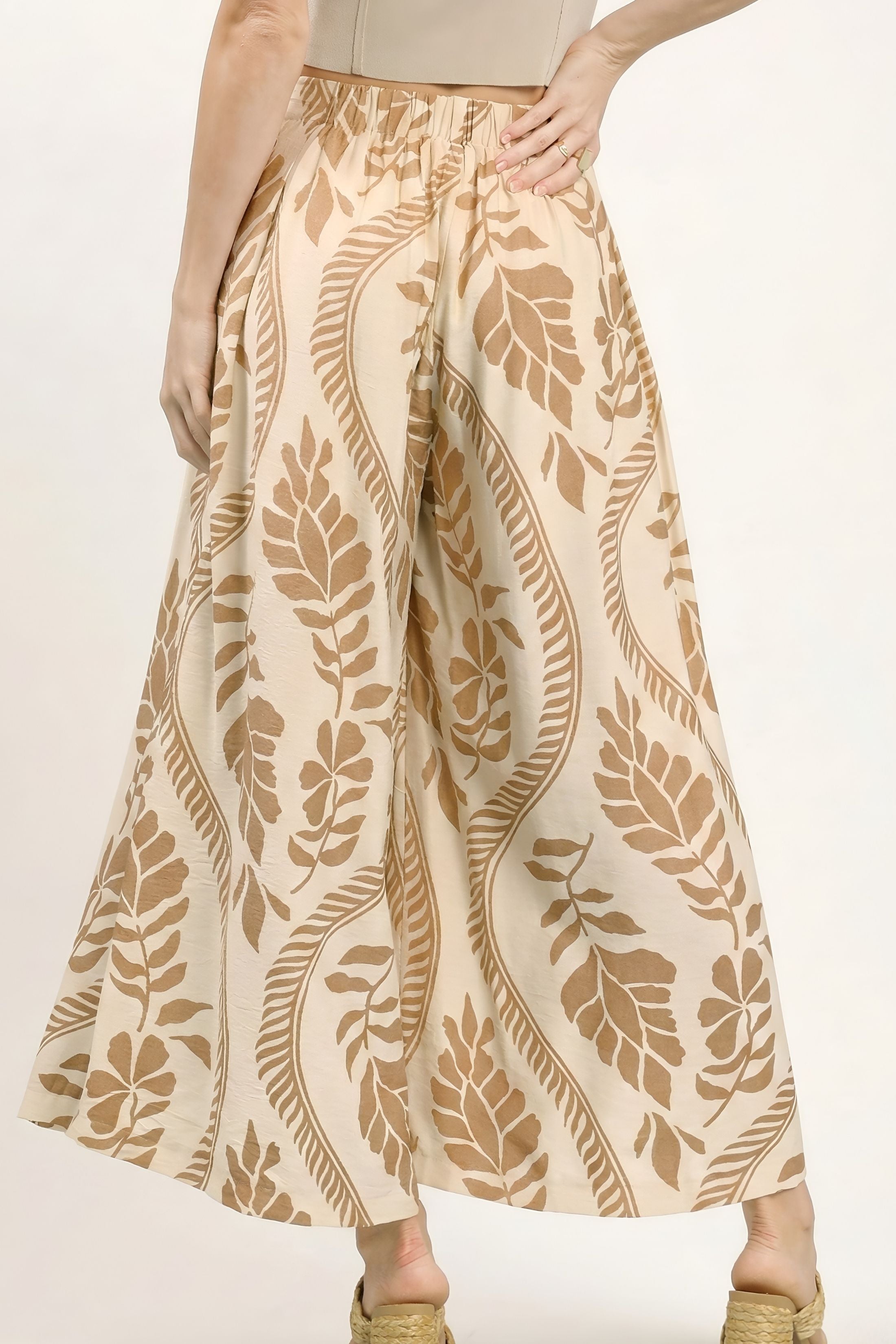 The Jess Tropical Leaf Print Wide Leg Pants make a bold, breezy statement with their vibrant leaf print and flowing silhouette. Designed for comfort and movement, they’re perfect for vacations, summer events, or elevated everyday wear. Effortless, eye-catching, and chic.