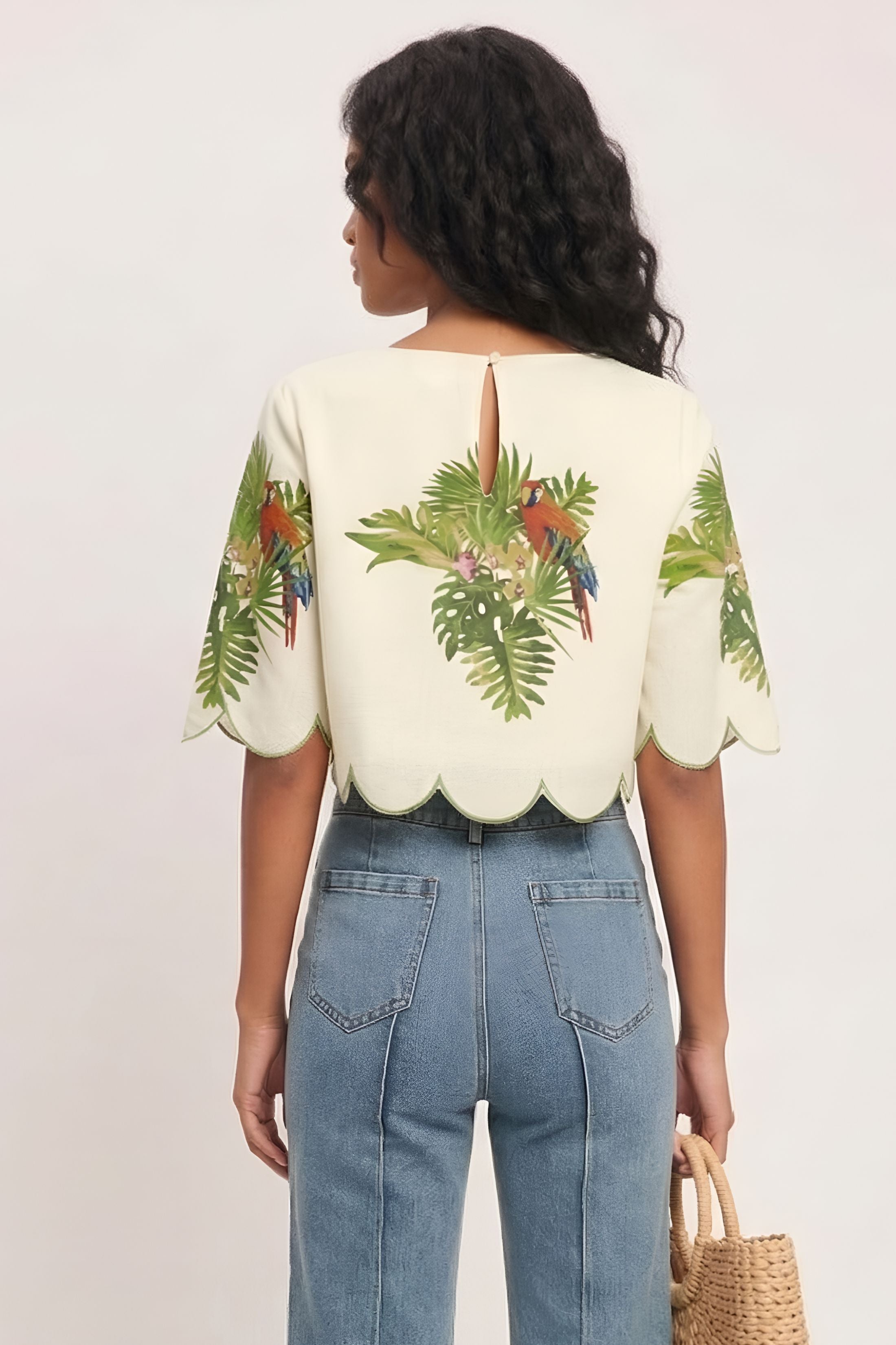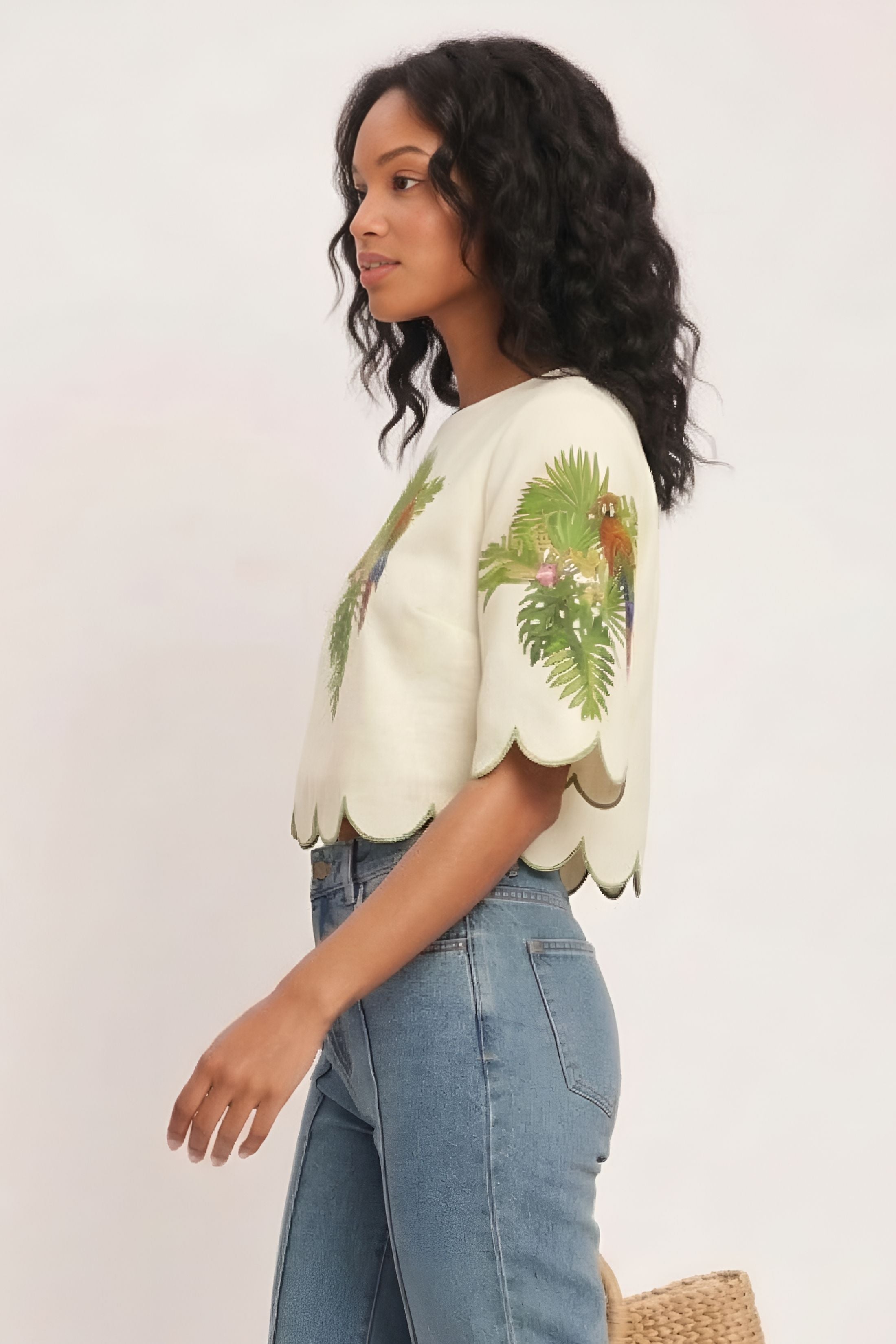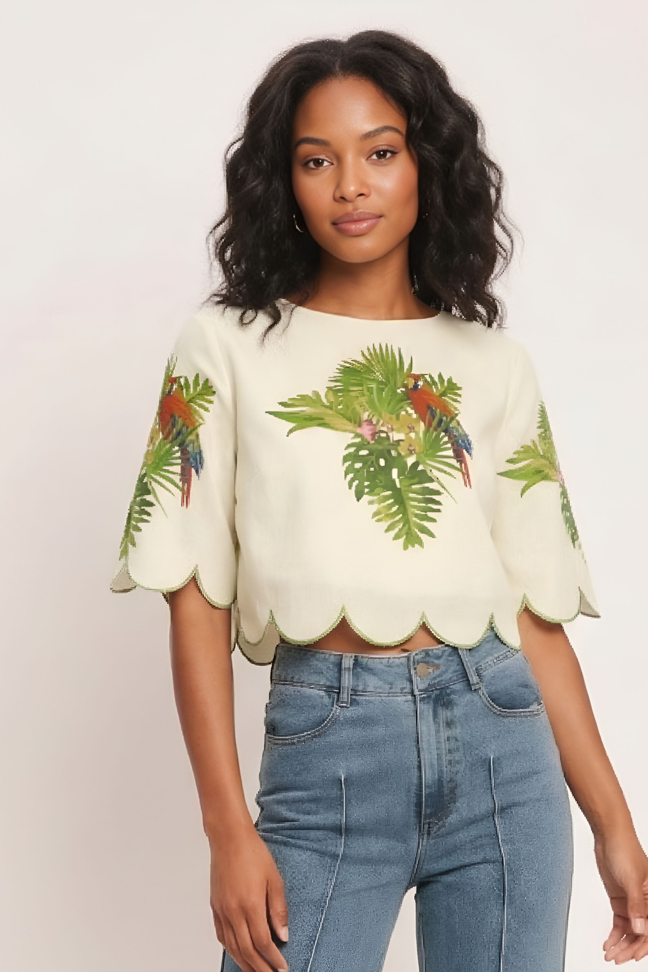 The Sally Tropical Scallop Edge Top brings a playful, vacation-ready feel with its vibrant tropical print and feminine scalloped edges. Lightweight and easy to style, it’s perfect for warm days, brunch plans, or getaway looks. Fresh, flattering, and effortlessly chic.