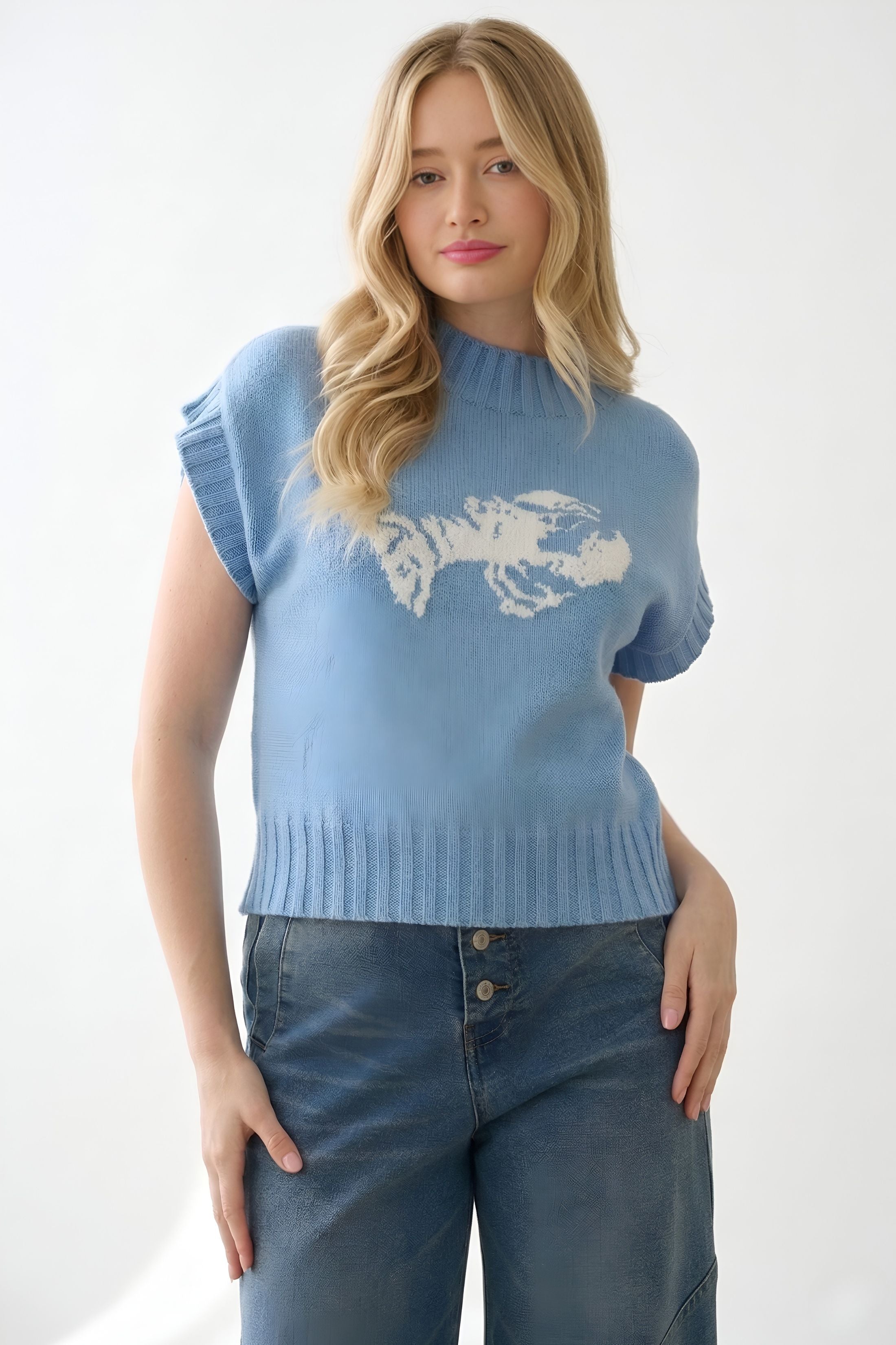 The Tilly Sleeveless Lobster Sweater adds a playful coastal touch with its charming lobster graphic and soft knit texture. The sleeveless silhouette makes it perfect for layering or wearing on its own during warmer days. Fun, relaxed, and effortlessly stylish.