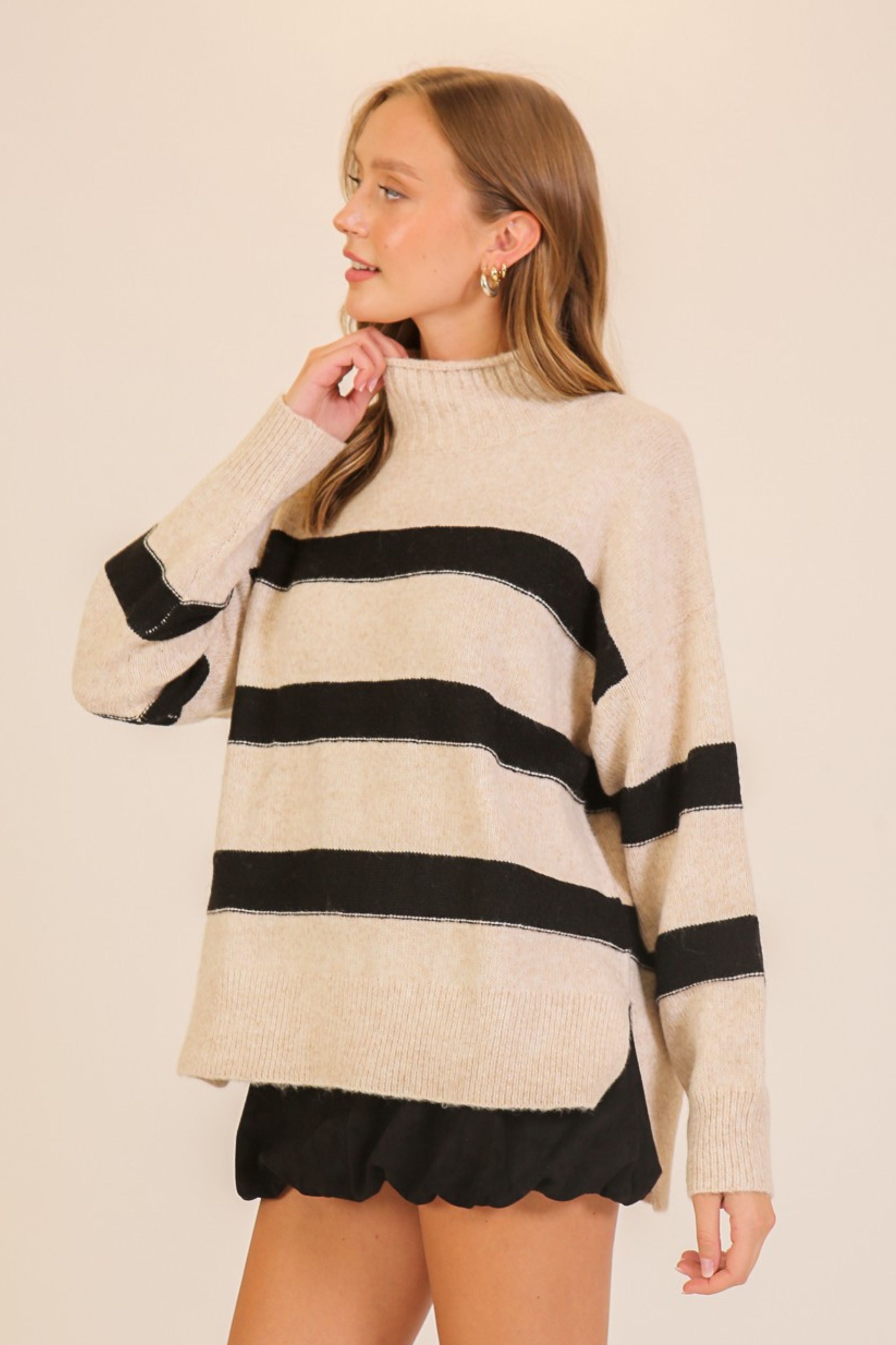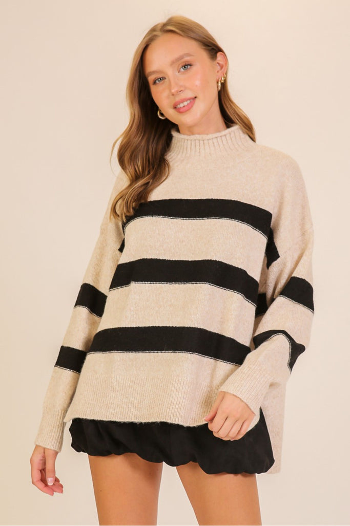 A cozy classic with a modern edge, the Anderson Sweater features bold stripes and a soft turtleneck design for a timeless look. Perfect for layering or wearing on its own, it brings effortless style and warmth to your everyday wardrobe.