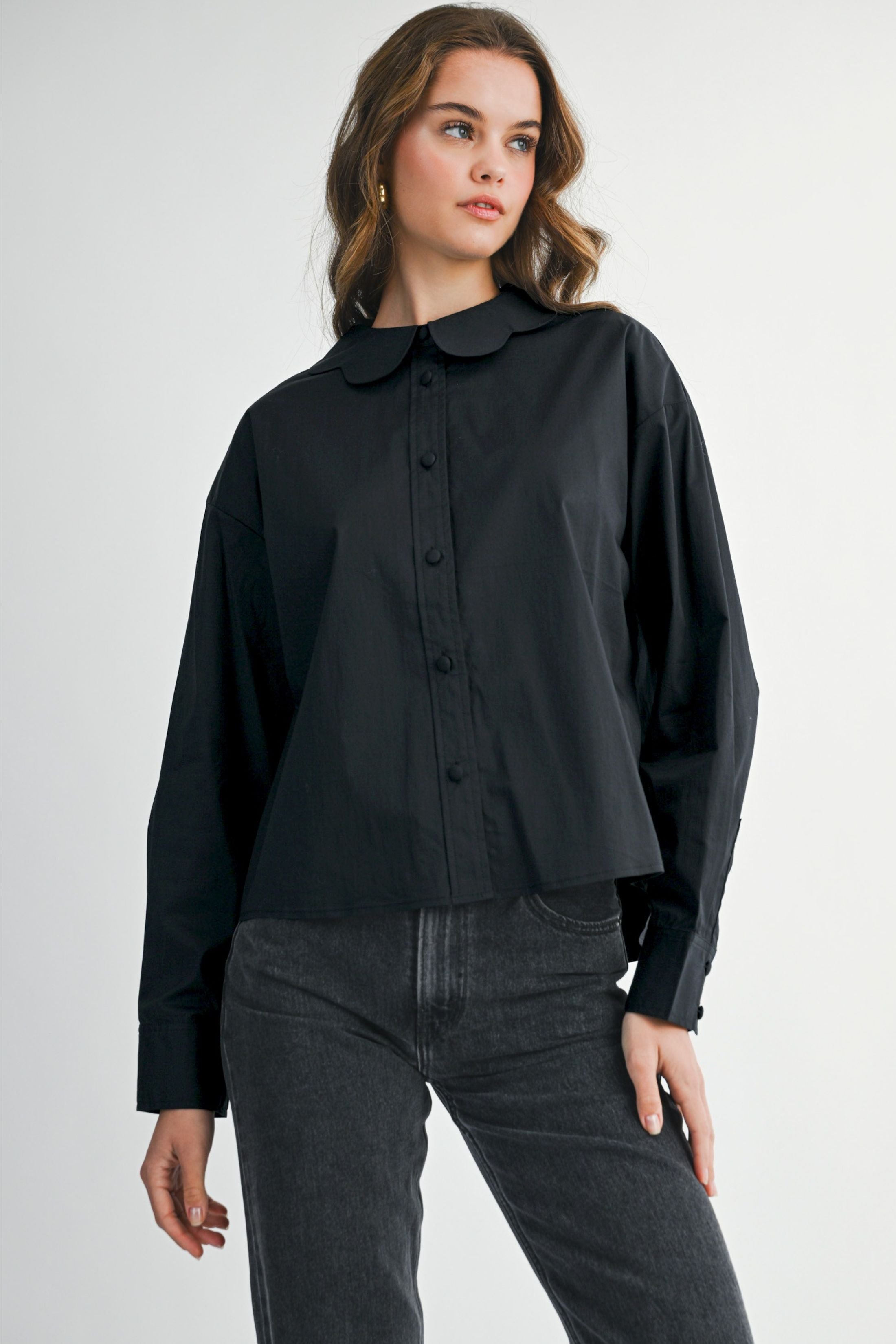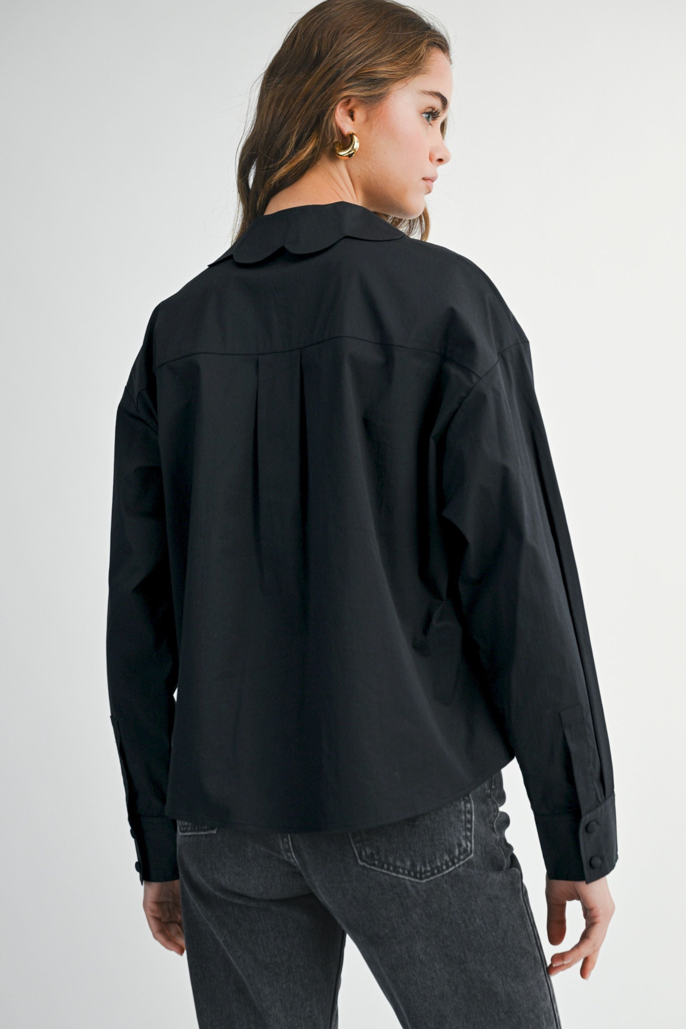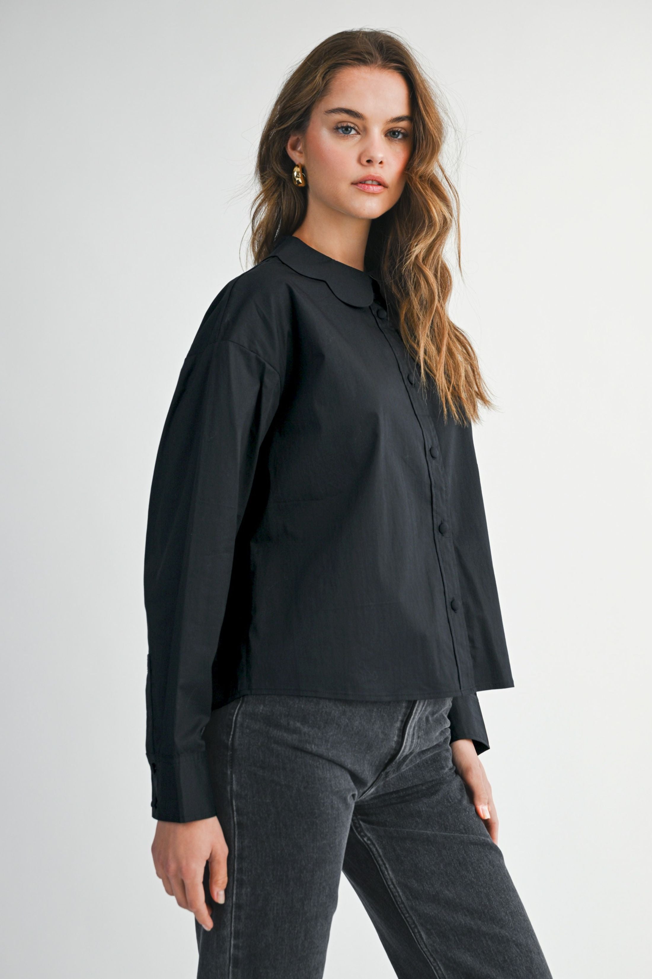 The Bianca Scalloped Hem Blouse adds a feminine touch to a classic silhouette with its delicate scalloped hem. Lightweight and versatile, it’s perfect for polished everyday styling.