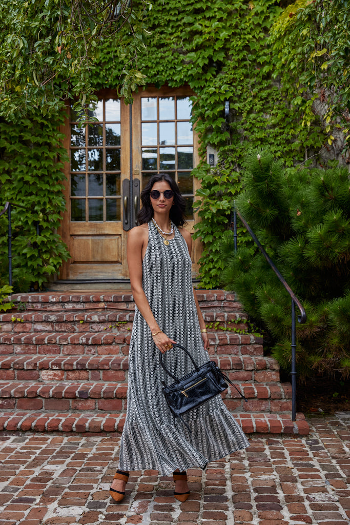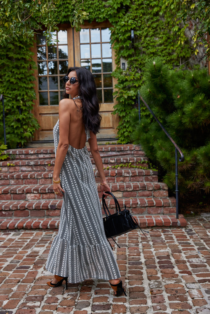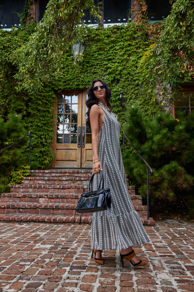 This maxi dress is a statement-maker with a halter neckline and a relaxed, flowy silhouette that flatters effortlessly. The ruffled hem adds movement with every step, while the black-and-white geometric pattern keeps it bold yet timeless. Perfect for those in-between fall days—layer it with a leather jacket and boots for a night out, or throw on a cozy cardigan for a more laid-back vibe.