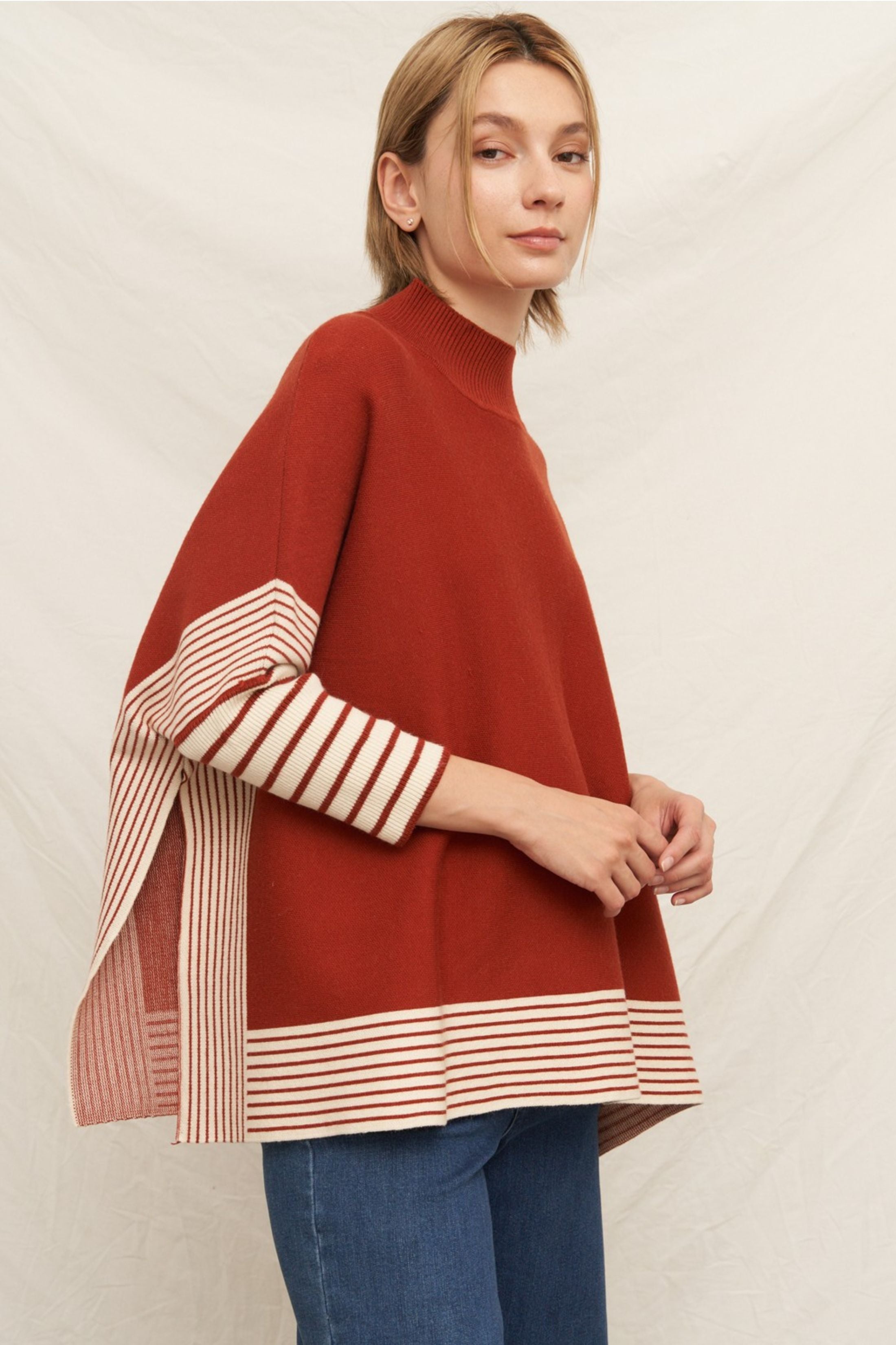 The Ginger Oversized Cape Sweater combines cozy comfort with a dramatic, flowing silhouette for effortless style. Soft and versatile, it’s perfect for layering or making a statement on its own.