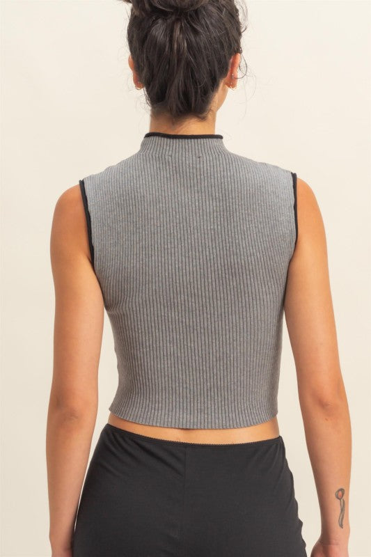 Cozy up in autumn style with this sleeveless knit crop top, featuring a chic turtleneck and bold black trim for just the right touch of edge. Perfect for layering under oversized flannels or pairing with high-waisted jeans and boots, this piece brings warmth and attitude to your fall wardrobe. The cropped cut keeps it playful, while the soft knit and snug neckline give off all the cozy vibes! No sleeves, no problem.