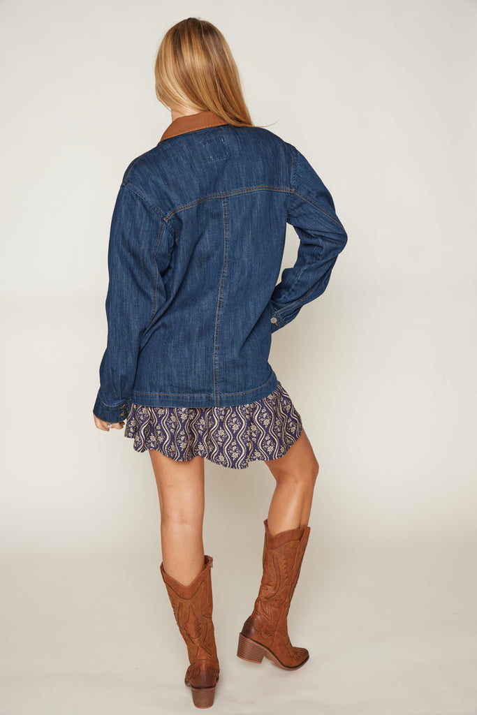 An everyday classic with a modern twist, the Lia Jacket features an oversized fit and a sleek leather collar for an effortlessly cool look. Perfect for layering, this denim staple brings a mix of casual ease and elevated edge to any outfit.