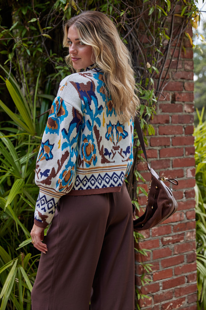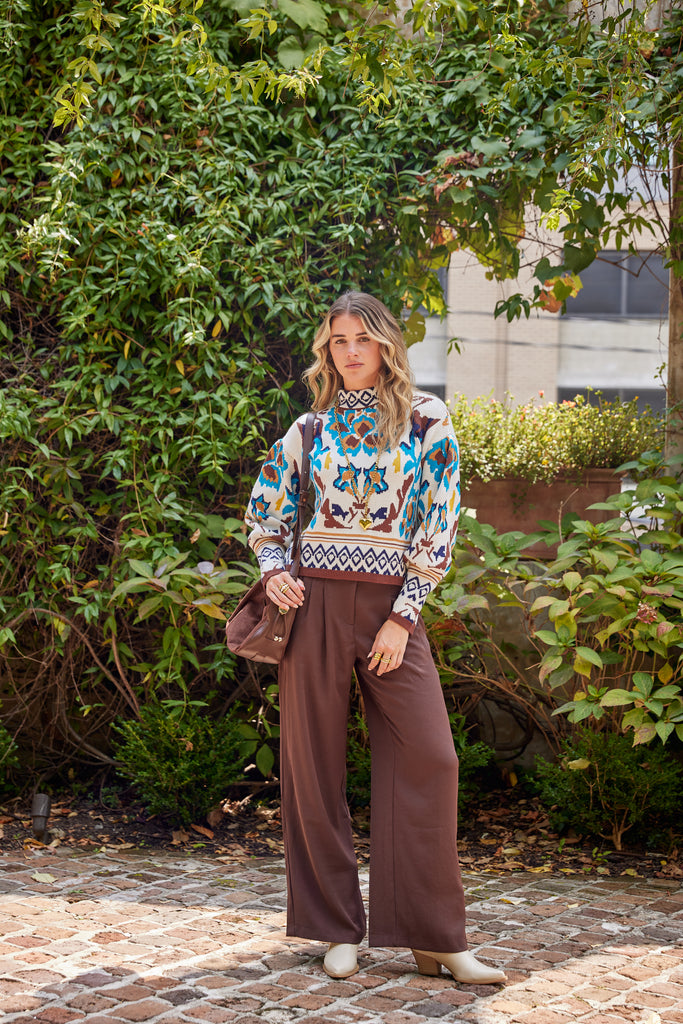 The Mia Sweater is cozy with a creative twist. Designed with a mix of playful knit patterns, this piece brings texture and charm to your everyday look. Its relaxed fit and soft knit fabric make it the perfect sweater to pair with denim or skirts all season long.