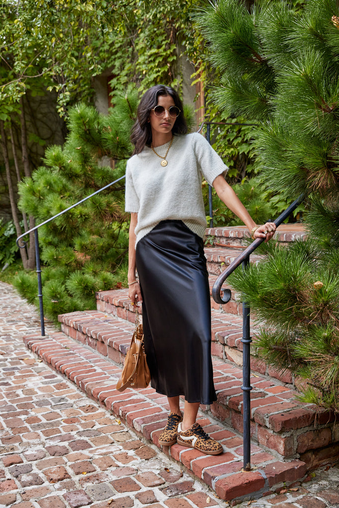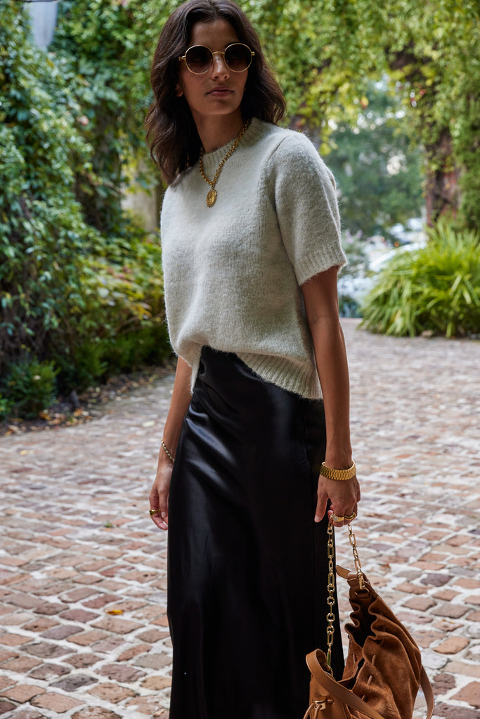 Simple yet sophisticated, this high-waisted maxi skirt is designed with an elastic waistband for a comfortable fit and a silhouette that gently skims the body. Effortlessly versatile, it can be styled up with a blouse and heels or kept casual with a tucked-in tee and sandals.