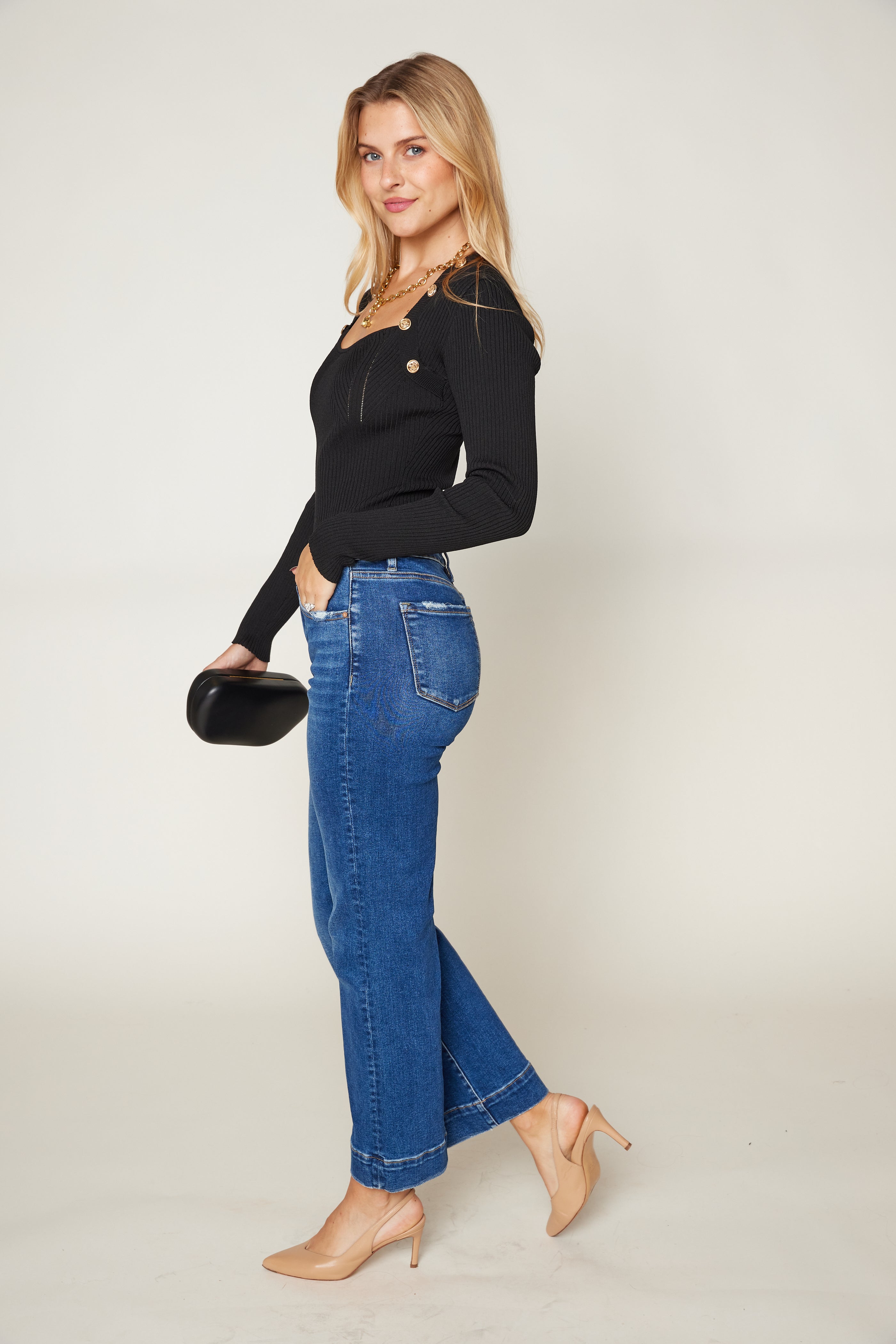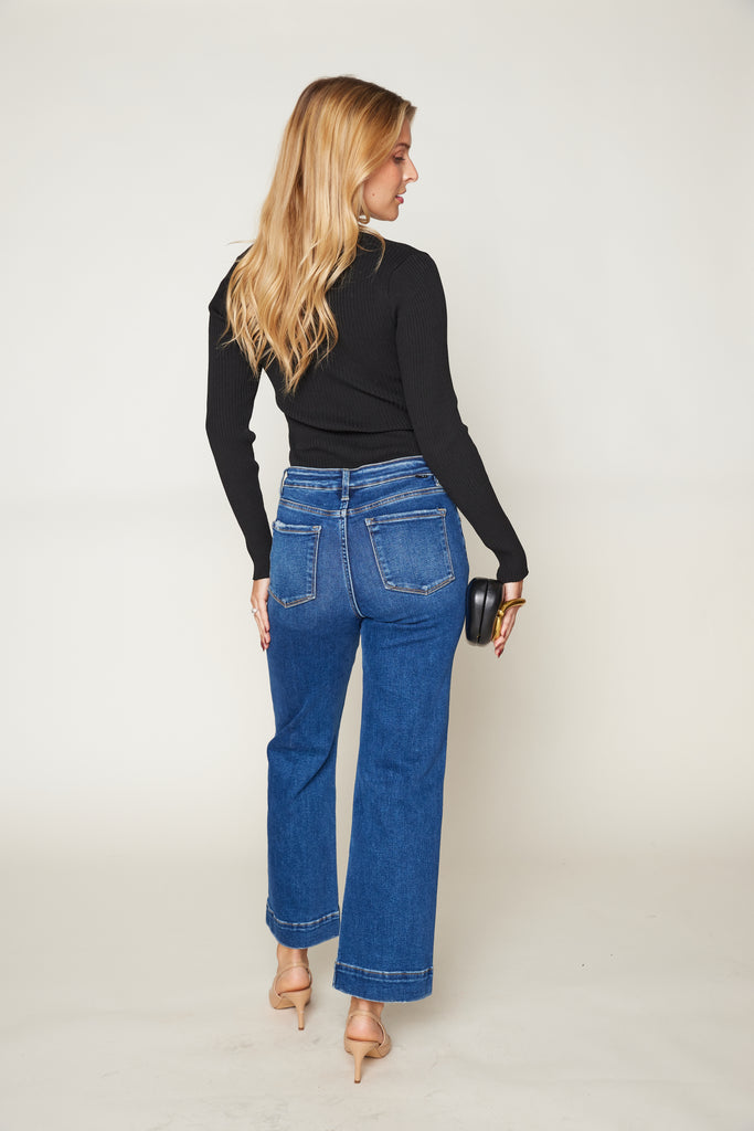 A timeless denim essential, these dark wash jeans feature a mid-waist fit and full-length silhouette. Designed with a cuffed hem detail and classic button-and-zipper closure, they offer a polished yet effortless look that pairs perfectly with casual tees or tailored tops.
