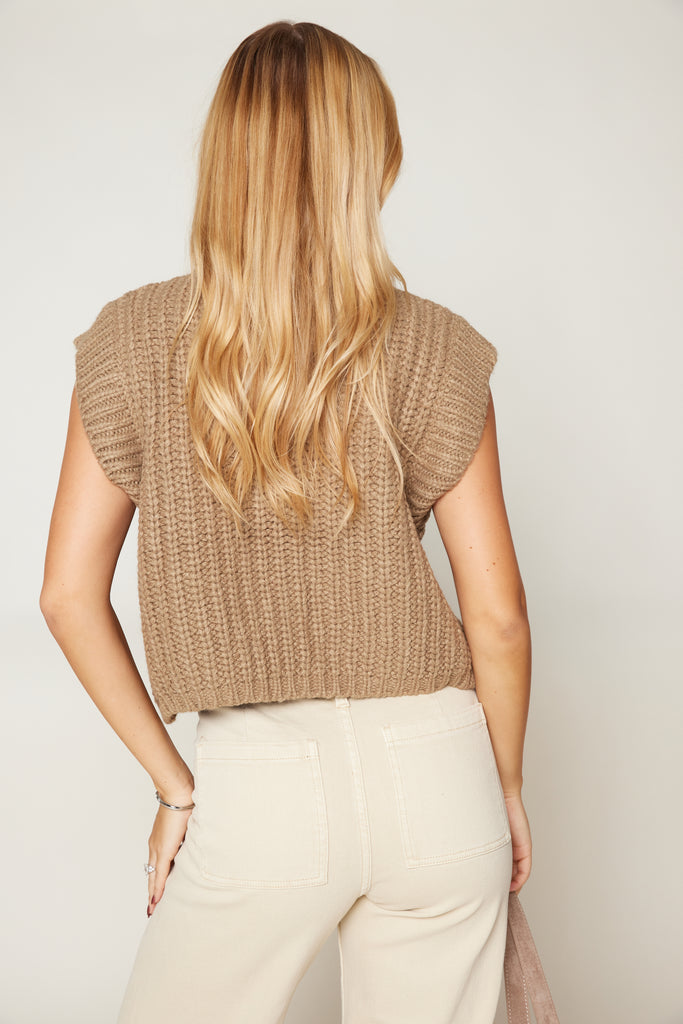 Elevate your layering game with this sleeveless high-neck sweater vest. Featuring an oversized gold button-down front, it adds a chic, sophisticated touch to any outfit. Perfect for styling over blouses, dresses, or even on its own with high-waisted trousers for a modern, polished look.