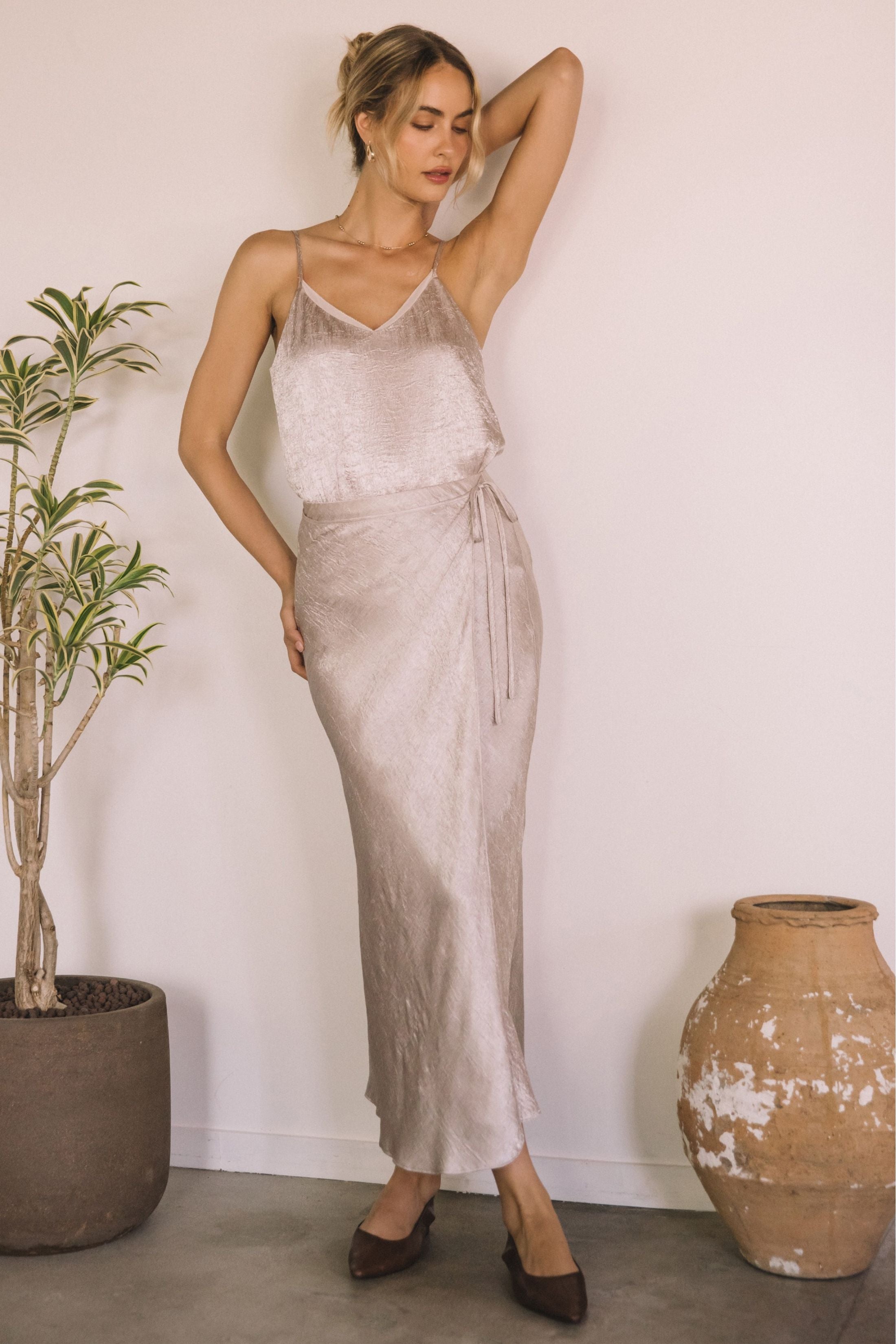 The Terry Satin Skirt is a sleek and feminine piece featuring a smooth satin finish and flattering midi silhouette. Perfect for dressing up or styling casually, it adds an elegant touch to any outfit.